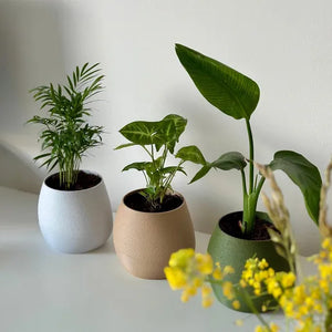 • 3 × 6-inch self-watering planters (in white, sand, and olive)