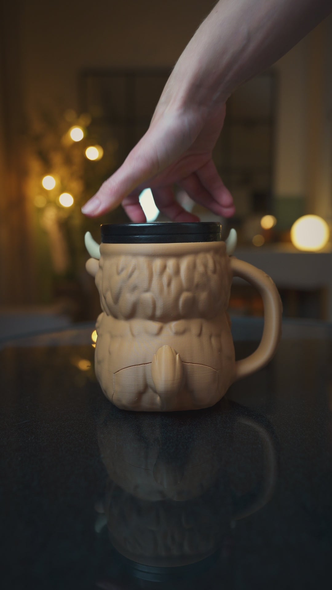 • Cozy comfort meets cool utility — With his soft “fringe,” gentle smile, and curved horns, Ferdinand gives your hands warmth while your treat stays icy.