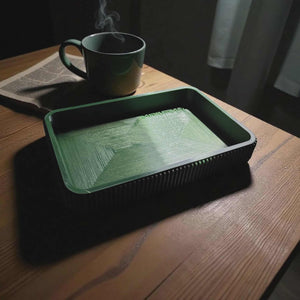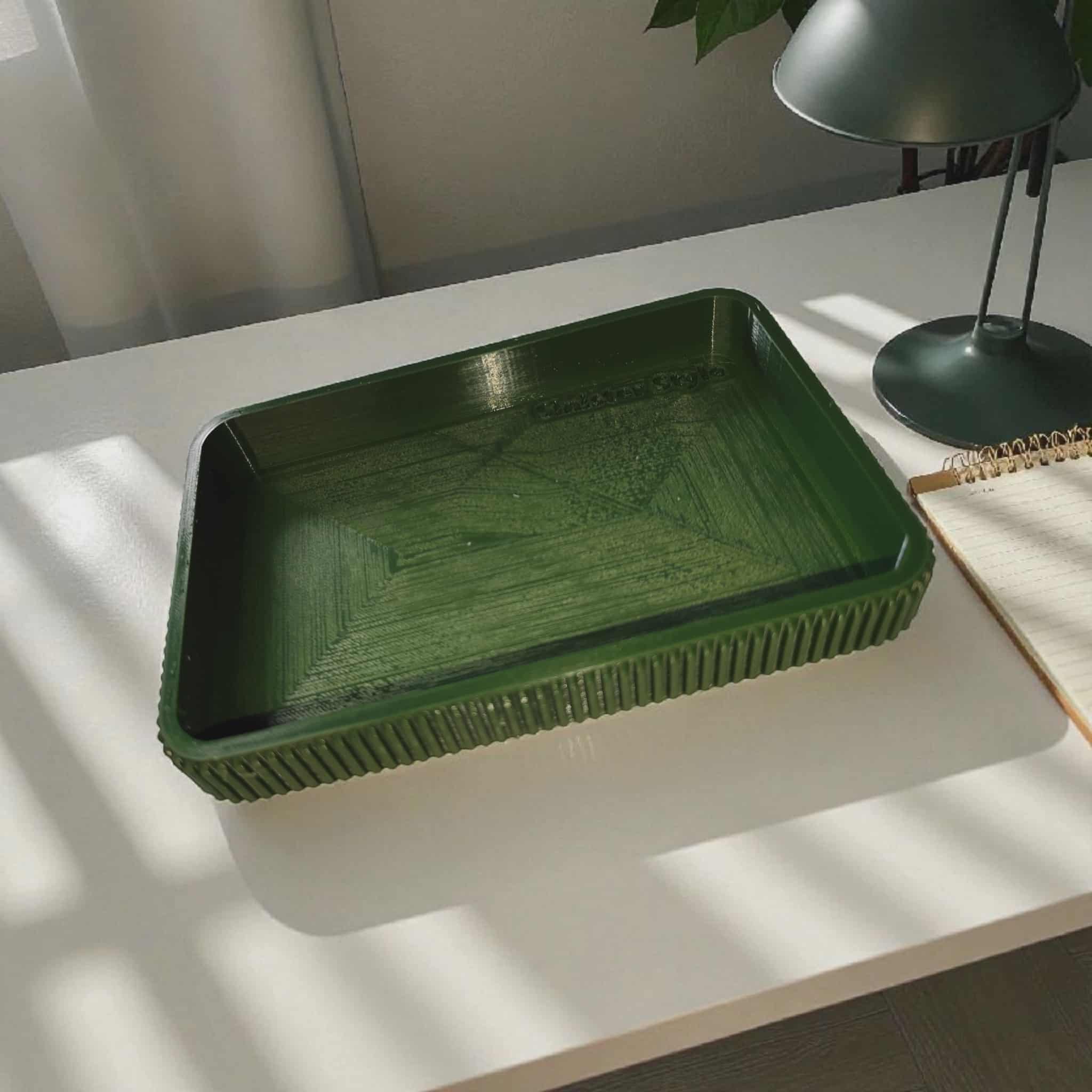 Keep your essentials stylishly contained with this modern 3D-printed catch-all tray, designed for minimalists who value form and function. Crafted in a deep olive green PLA with clean lines and a subtly textured edge, it brings an elegant yet practical touch to any space.